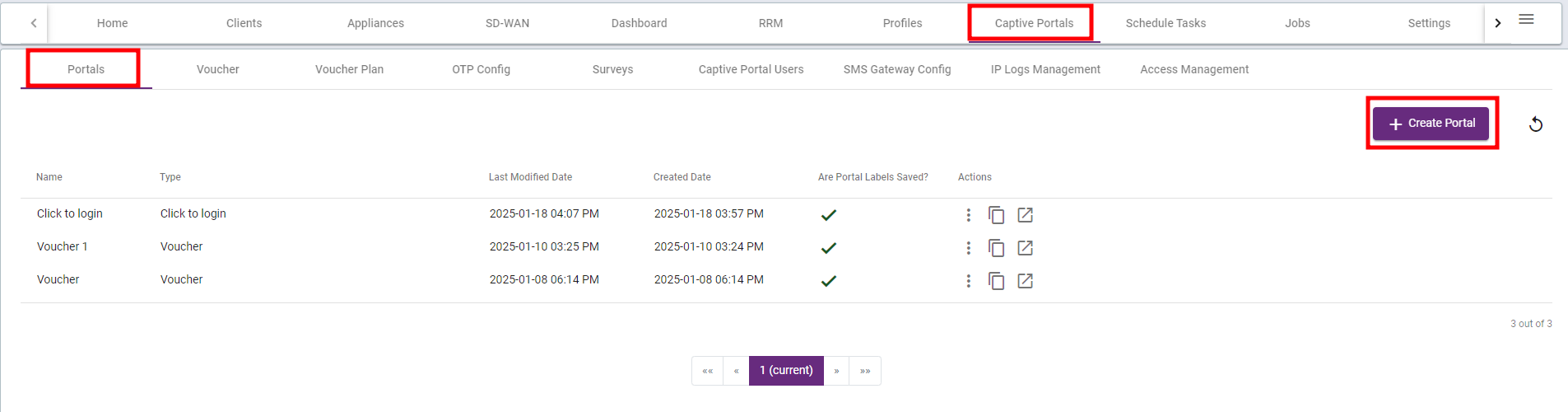 - In the Captive Portal page, click on the +Create Portal button to create a new portal.