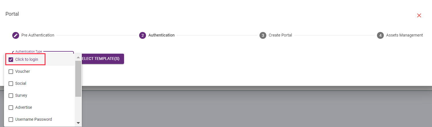- Under the Authentication section, select the Click to Login Type from the available options.