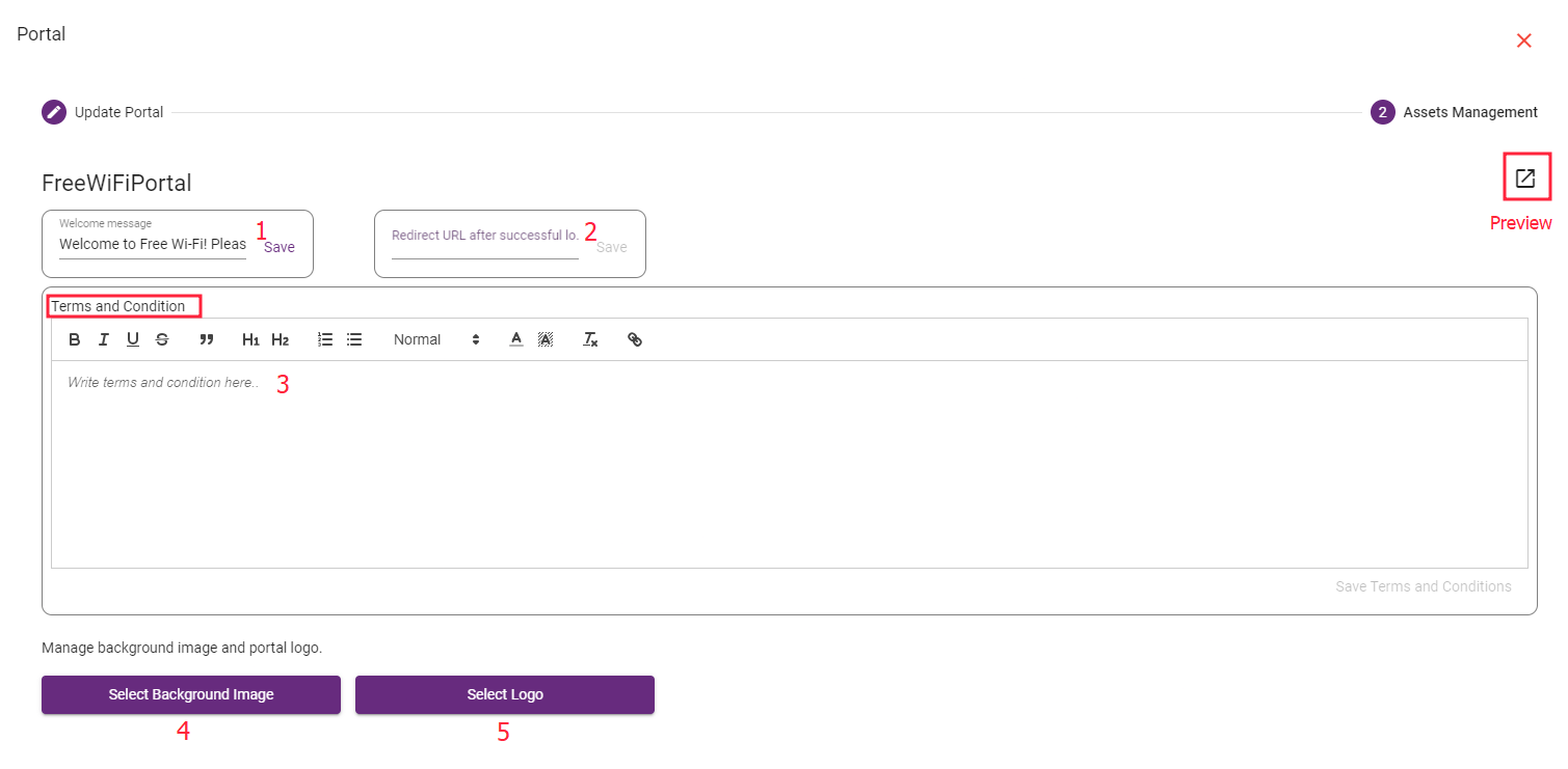 In the Assets Management page, you can also Upload a logo and Image to personalize your portal’s page.