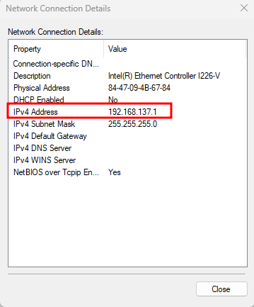 The IP address is now received through Internet Connection Sharing via Wi-Fi.