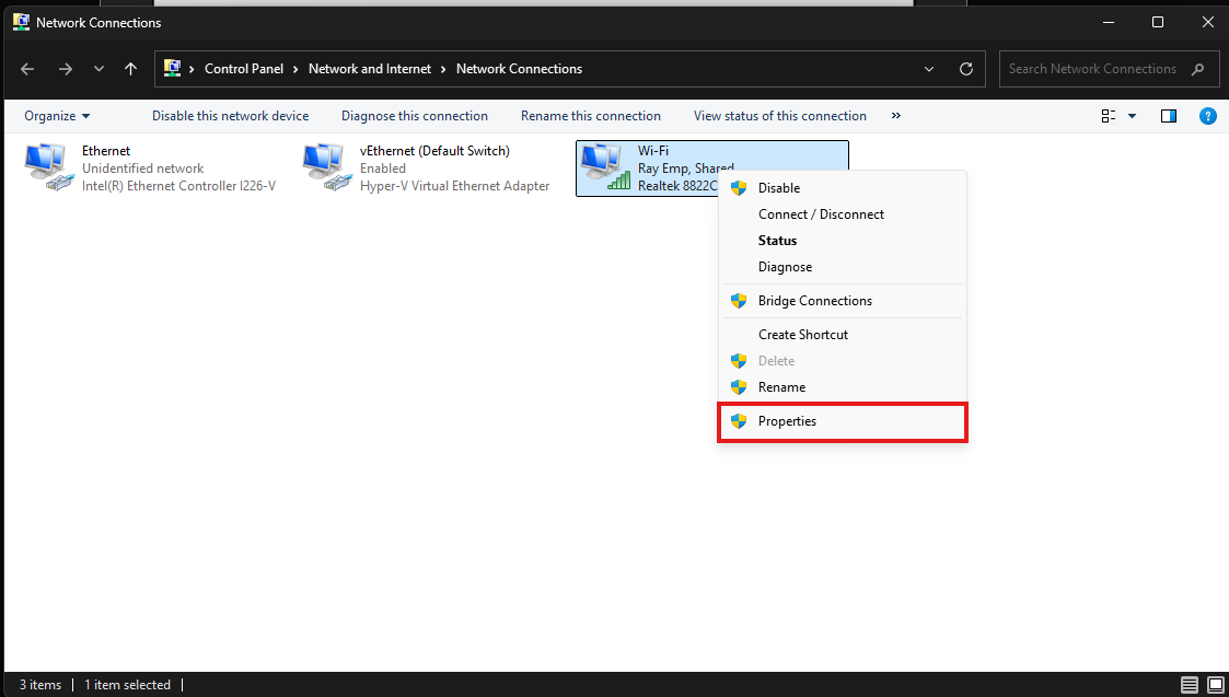 Step 2: Right-click Wi-Fi, select Properties.