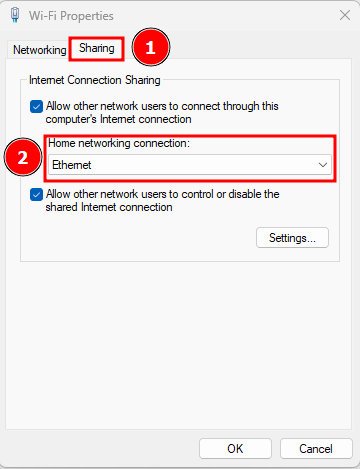 Step 3: Go to the Sharing tab, select your home network connection (for example, Ethernet), and click OK.