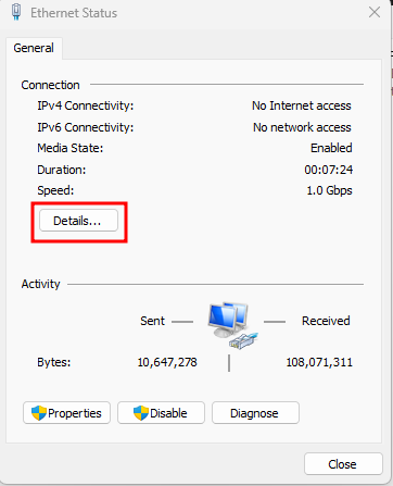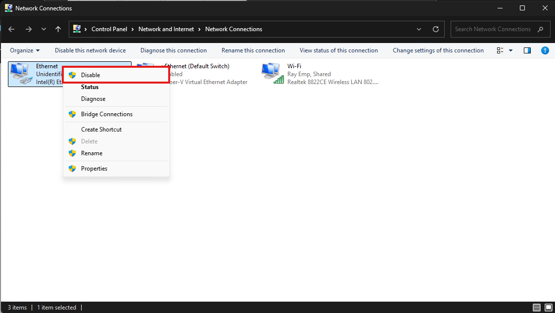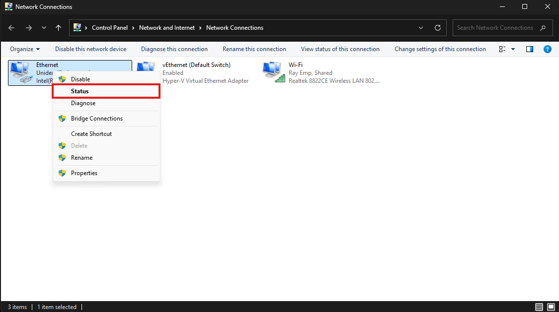 Step 4: Now, connect the Ethernet cable and verify that an IP address is assigned. Then, right-click the Ethernet connection and select Status.