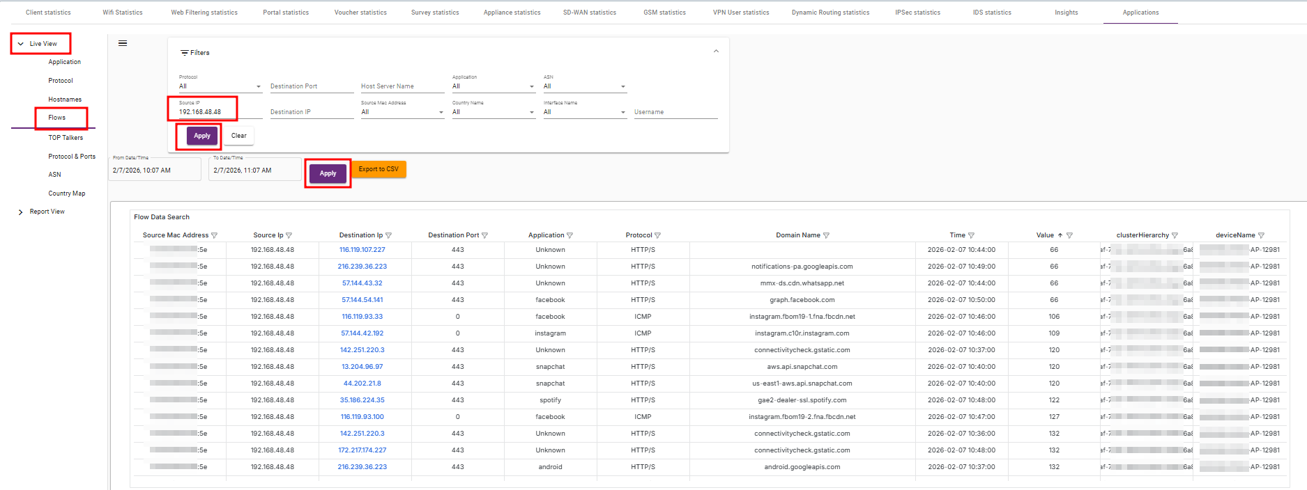- Source MAC Address: Choose to filter by the source device’s MAC address.